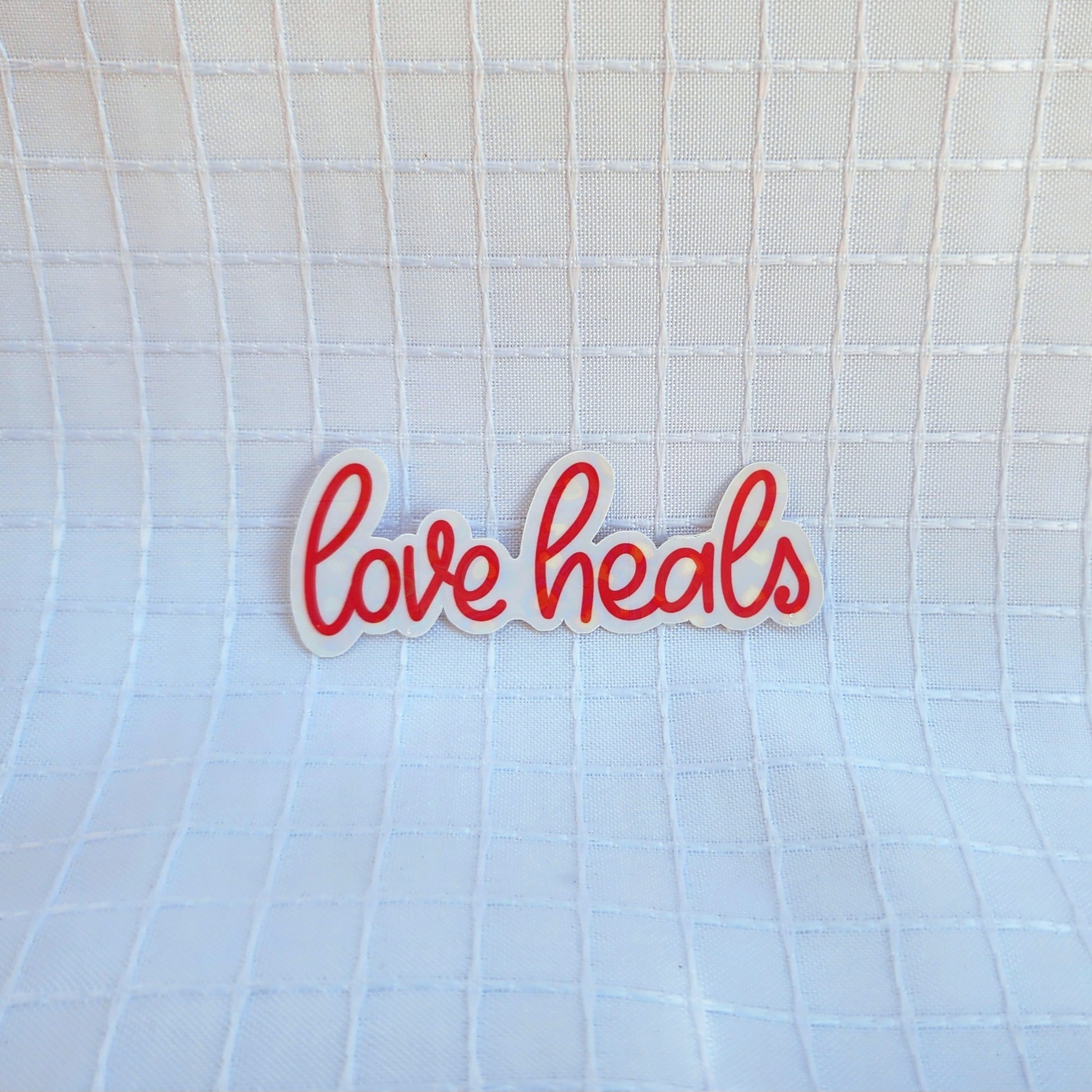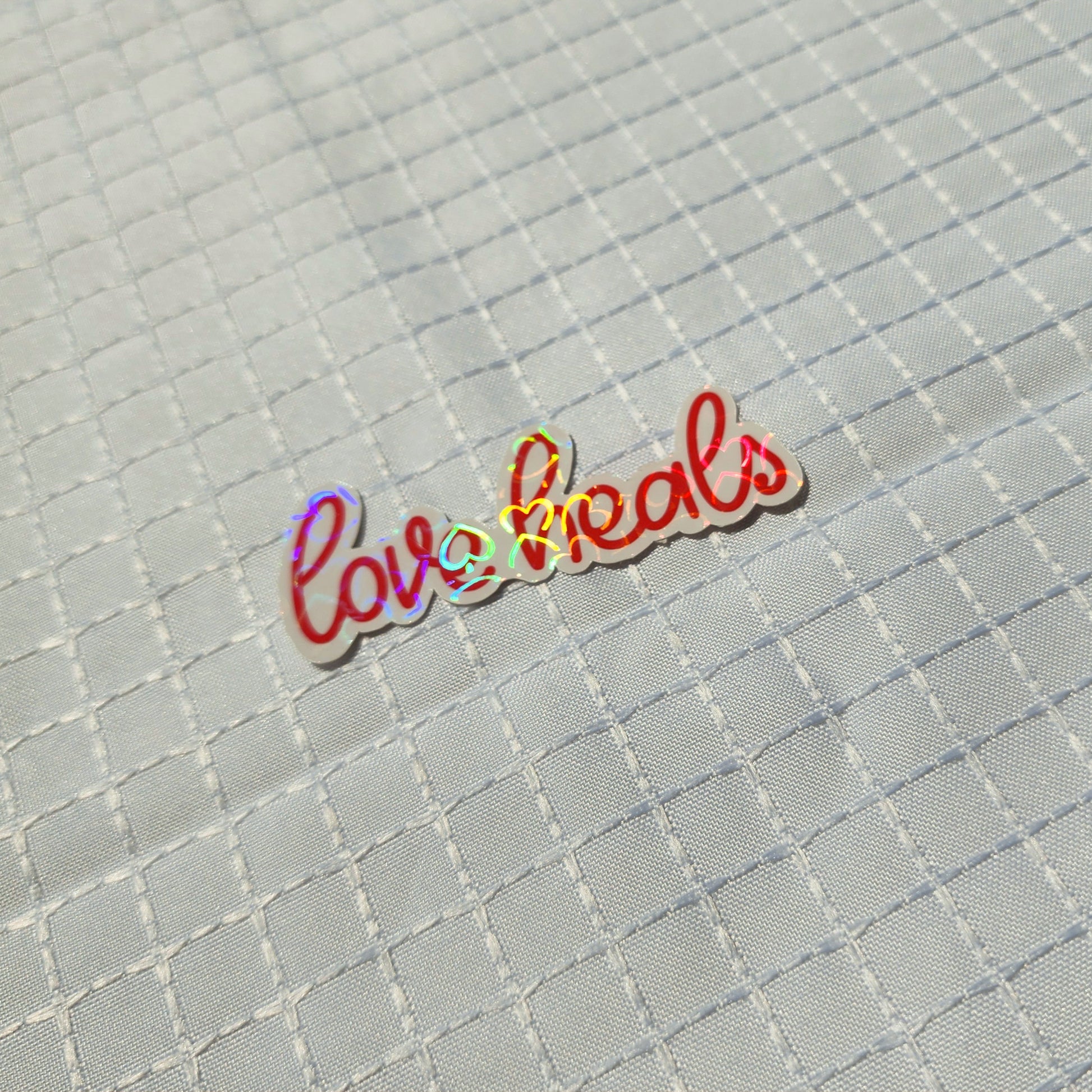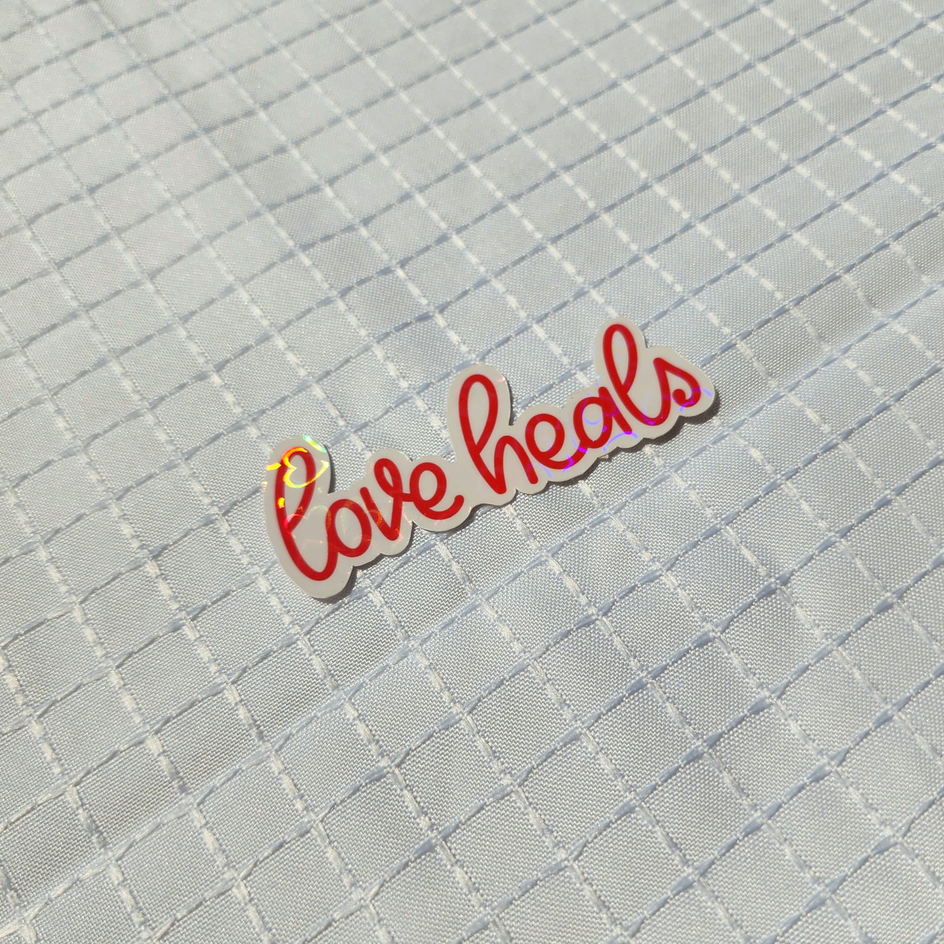 Express the power of compassion with the Love Heals sticker. This sticker is a perfect way to share a message of healing and love wherever you place it. Featuring shimmering holographic hearts that catch the light beautifully, it's the perfect addition to laptops, journals, or personal spaces, reminding everyone that love is a vital force for recovery and connection.